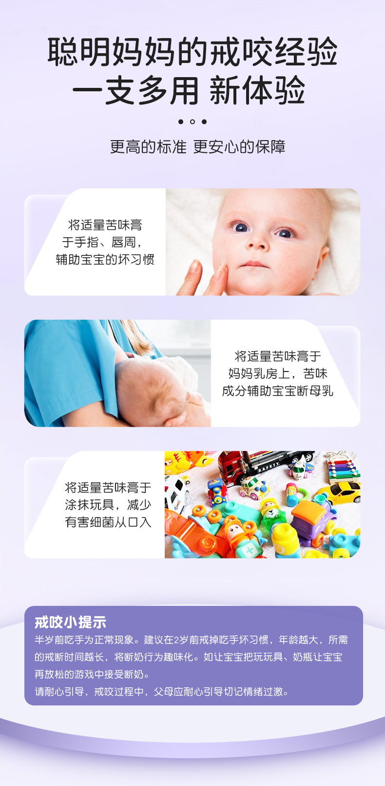 使用方法:取適量本品均勻的涂抹于皮膚表面上,也可用于玩具、筆頭等需要阻止孩子啃咬的地方。