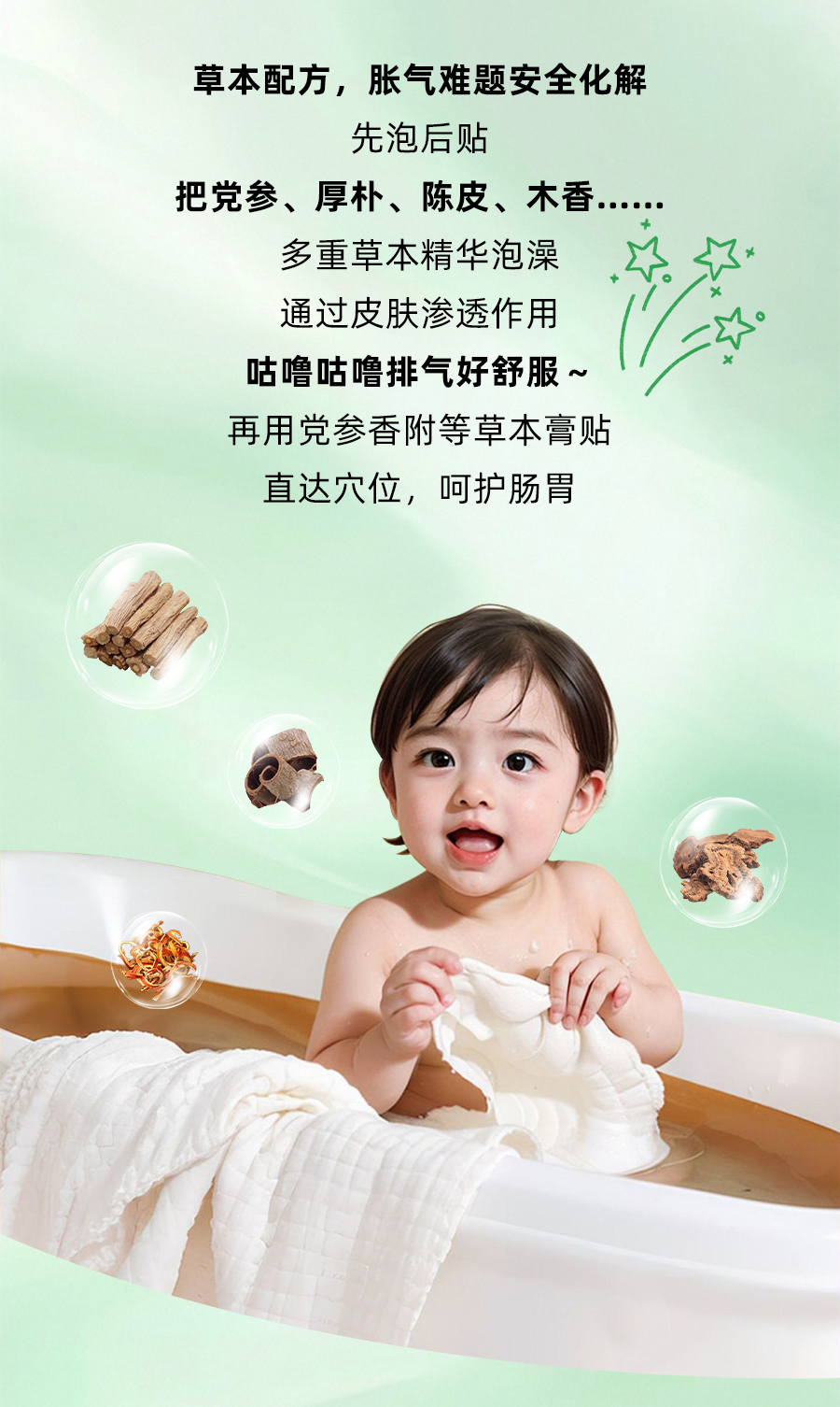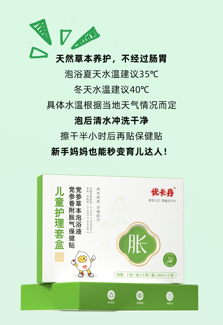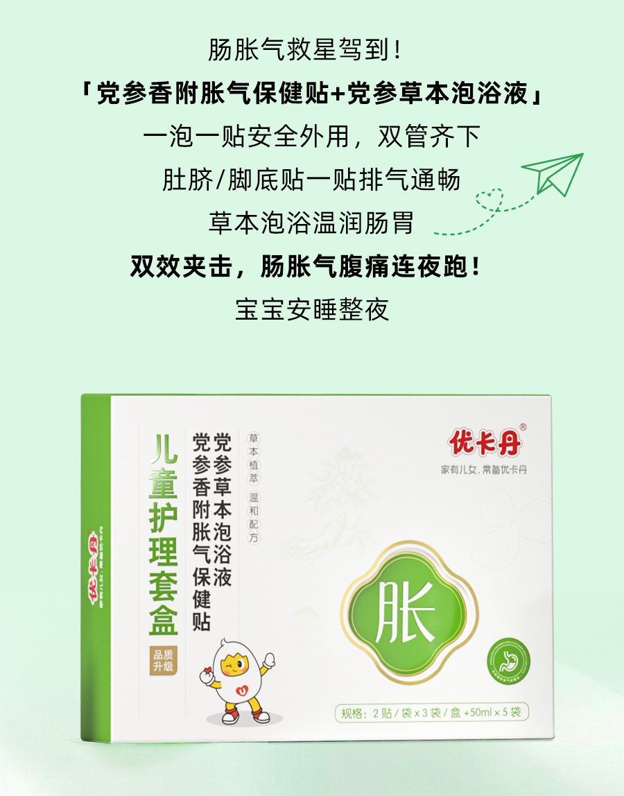 【產(chǎn)品名稱】優(yōu)卡丹兒童草本脹氣護(hù)理套盒(黨參香附脹氣保健貼、黨參草本泡浴液)