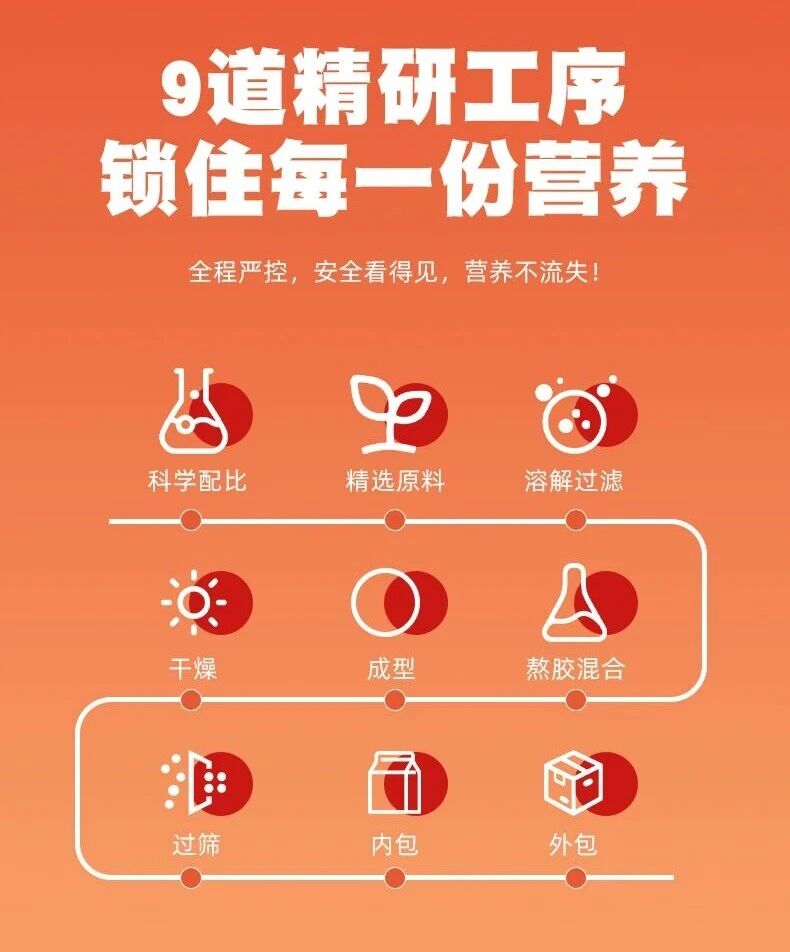 優(yōu)卡丹這顆軟糖,不僅成分選得講究,制作上也下了功夫:從科學(xué)配比原料,到溶解過濾、熬膠混合,再到成型干燥、過篩包裝,整整9道工序,鎖住營養(yǎng)不流失。