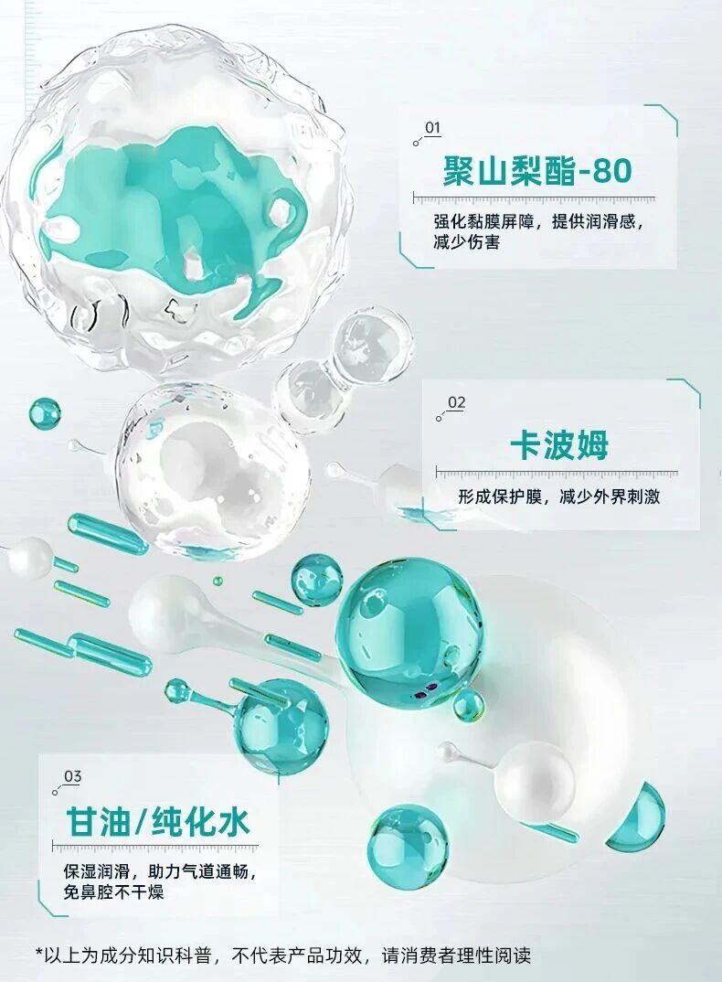 其中,卡波姆能幫助形成一層保護膜,減少外界刺激;聚山梨酯- 80強化鼻黏膜屏障,還能提供潤滑感,減少過敏原對鼻腔的傷害;甘油和純化水則能起到保濕潤滑的作用,避免鼻腔干燥,助力氣道通暢。