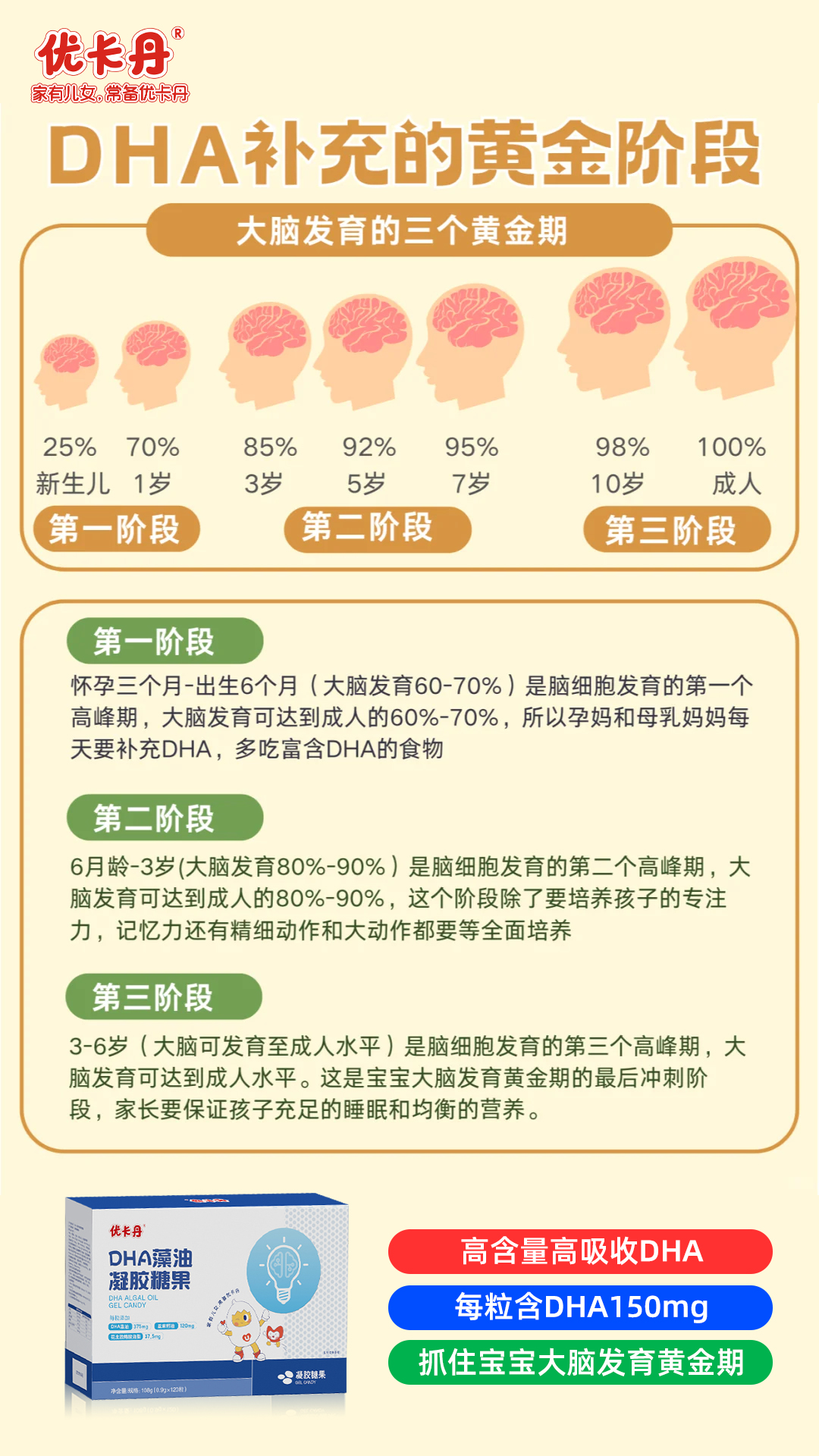 DHA補充圖解|一張圖帶你了解補充DHA的關鍵期 發布時間:2025-11-05 11:23:13 瀏覽量:42 您知道嗎?寶寶大腦發育的黃金期,一生只有一次。從出生到3歲,大腦發育將完成成人大腦的近90%,這是一個不可逆的迅猛過程。在此階段為寶寶及時補充足量的DHA,就如同為他鋪設最關鍵的“聰明基石”,這份早期的營養投入,將轉化為他未來探索世界的無限潛能。家有兒女,常備優卡丹。